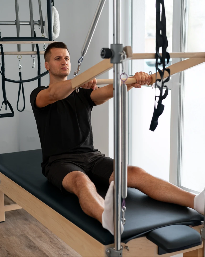 Porque oferece suporte e controlo excepcionais. A cama elevada facilita transferências para pessoas com mobilidade reduzida. As molas permitem assistência gradual, reduzindo carga gravitacional conforme necessário. A variedade de pontos de fixação possibilita isolamento muscular específico essencial em reabilitação funcional. Na Formação VOLL, aprende aplicações clínicas do Cadillac: protocolos pós-cirúrgicos, gestão de dores crónicas, recuperação neurológica. Compreende contraindicações, progressões seguras e quando referenciar para avaliação médica. Este conhecimento permite trabalhar com fisioterapeutas e integrar-se em equipas multidisciplinares de reabilitação.